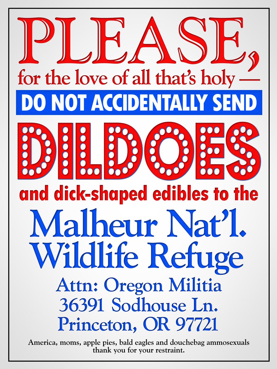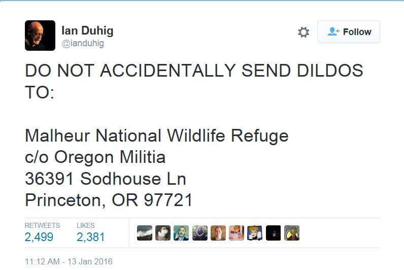 Occupier says 50-100 packages come in per day to #Oregonstandoff. ~half are gag gifts, such as douches and sex toys. http://j.mp/1KsIYiV