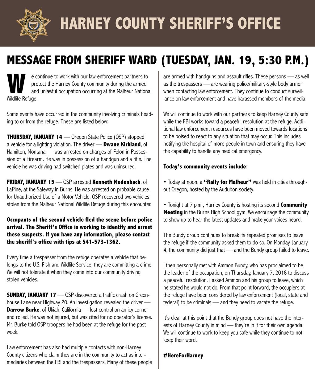 The FBI recognizes that many in the community have questions about why we are here and our role in helping to end the occupation of the wildlife refuge. We are here to work closely with Sheriff Ward and our local, state and federal partners to protect the safety and welfare of this community. This occupation has caused tremendous disruption and hardship for the people of Harney County, and our response has been deliberate and measured as we seek a peaceful resolution. Due to safety considerations for both those inside the refuge as well as the law enforcement officers involved, we will not be releasing any specifics with regards to the law enforcement response.