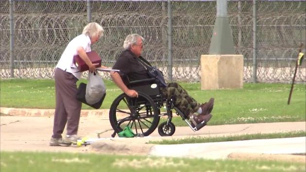Hastert, who began using a wheelchair after falling ill last year, wore a black shirt and camouflage pants as he wheeled himself into the complex between razor-wire fencing. The only person accompanying him was a woman, who followed him carrying crutches, a plastic bag and a small brown box.