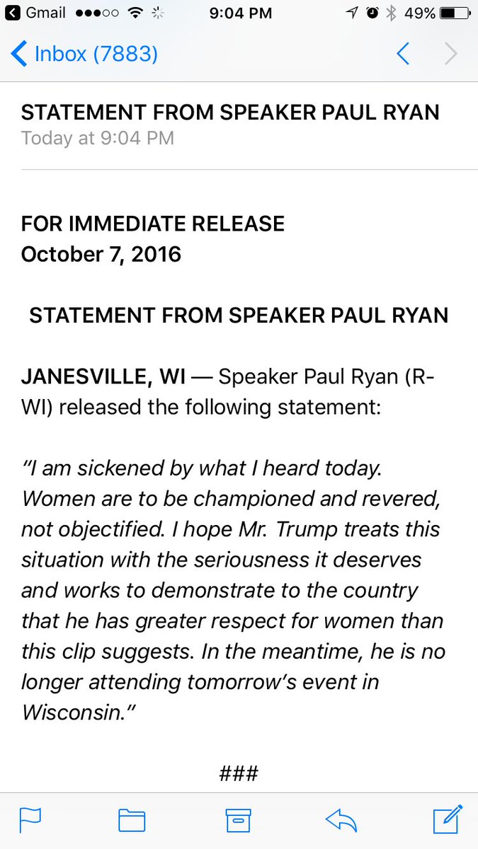 Paul Ryan: I am sickened by what I heard today. Mr. Trump is no longer attending tomorrows event in Wisconsin.