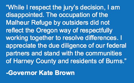 #BREAKING: Jury finds 7 Malheur occupiers not guilty of conspiring to impede federal workers from doing jobs at refuge. #OregonStandoff