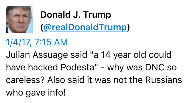 Julian Assange said a 14 year old could have hacked Podesta - why was DNC so careless? Also said Russians did not give him the info! Trump wrote on Twitter Wednesday morning. That post replaced an earlier one with similar language in which Assanges name was misspelled.