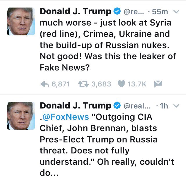(7,604 posts)Trumpy's only concern is whether HE has the headlines. Even negative attention is better than none. Trumpy has no intellectual understanding of Brennan's warning. Emotionally, Trumpy is likely upset at the suggestion that he's doing something wrong, and will likely retaliate against Brennan with some kind of derogatory reply-- something like, "Brennan ran a false news lab out of the CIA headquarters. He's a disaster."