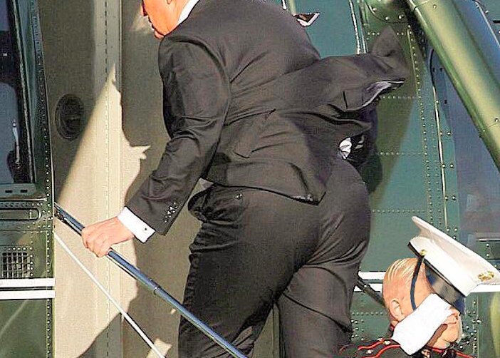 The back flap on his double vent always gets blown off his butt and exposes all of his colossal anatomy.