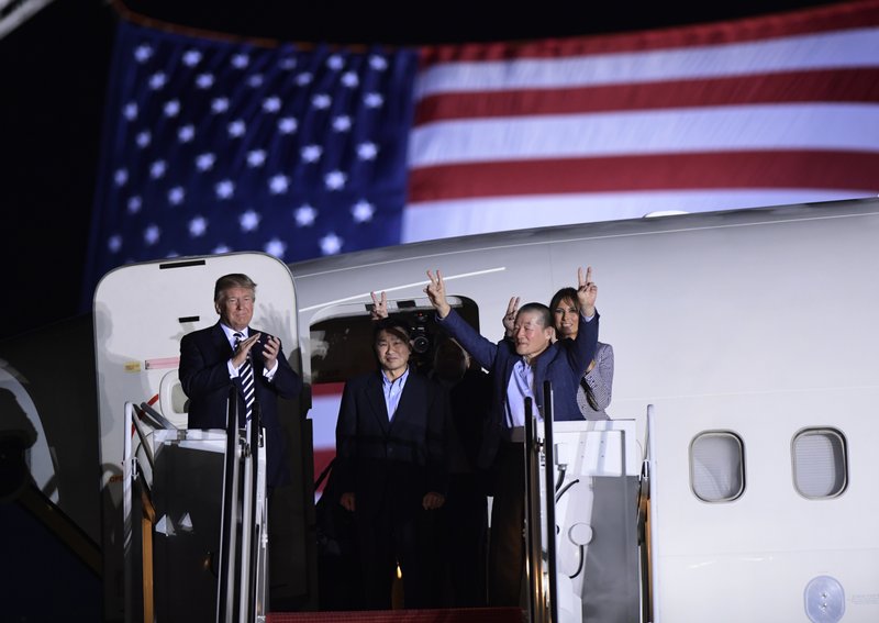 JOINT BASE ANDREWS, Md. (AP) In a made-for-TV ceremony in the dead of night, President Donald Trump on Thursday welcomed home three Americans freed by North Korea and declared their release a sign of promise toward his goal of denuclearizing the Korean Peninsula.