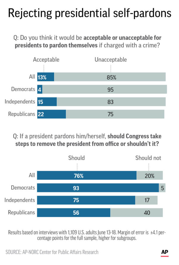 NEW YORK (AP) Even in an era of deep political division, Democrats and Republicans agree presidents should not pardon themselves. And if the nations chief executive ever does so, majorities of Americans in both parties believe Congress should impeach that president.