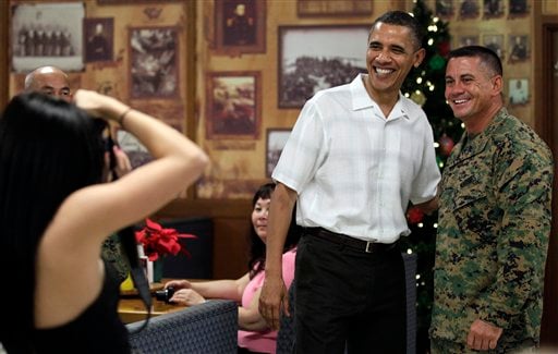 HONOLULU (AP) - President Barack Obama capped a quiet Christmas Saturday with a surprise visit to a Marine base to thank U.S. troops for the sacrifices they've made, including being away from their families at the holidays.