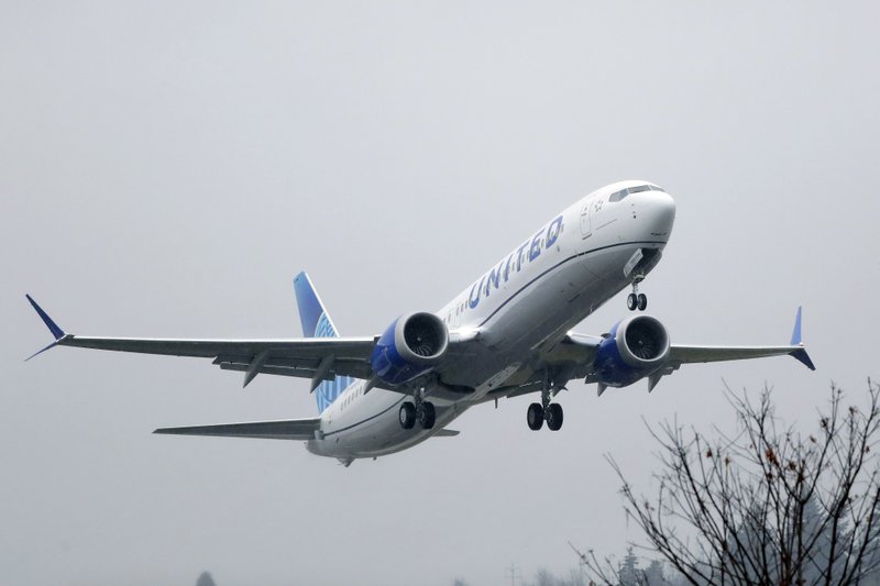 FILE - In this Dec. 11, 2019, file photo, an United Airlines Boeing 737 Max airplane takes off in the rain at Renton Municipal Airport in Renton, Wash. United Airlines said Friday, Feb. 14, 2020, that it is removing the grounded Boeing 737 Max from its schedule until early September, forcing it to cancel thousands more flights. (AP Photo/Ted S. Warren, File)