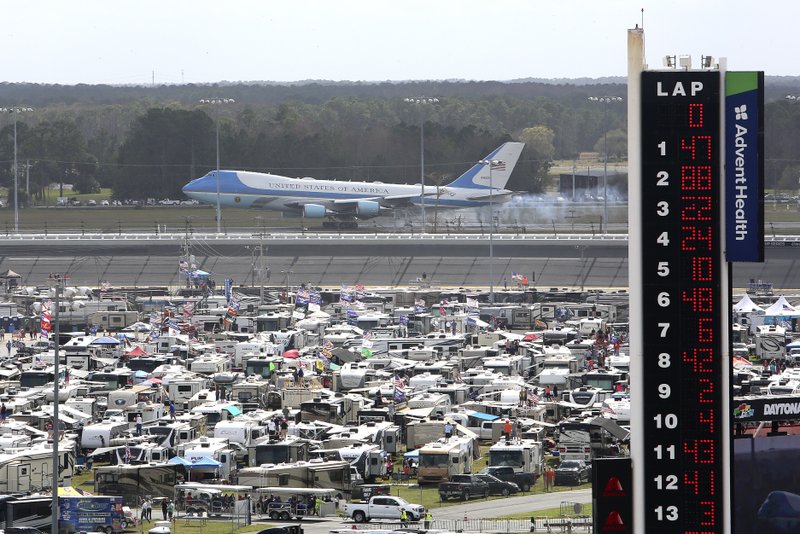 Thousands cheered as Air Force One performed a flyover and landed at Daytona International Airport a few hundred yards behind the track. Trumps motorcade arrived a few minutes later, prompting another loud ovation. Both entrances were broadcast on giant video boards around the superspeedway.