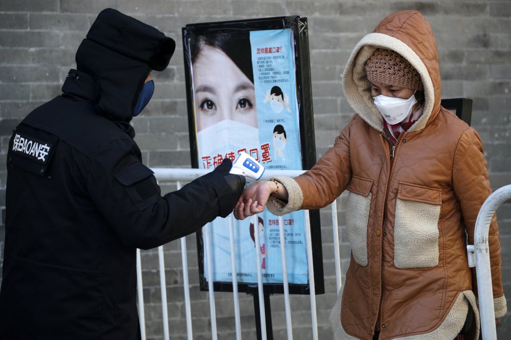 A woman wearing a protective face mask receives a temperature check from a security guard as she enters Qianmen Street, a popular tourist spot, in Beijing, Sunday, Feb. 16, 2020. China reported Sunday a drop in new virus cases for the third straight day, as it became apparent that the country's leadership was aware of the potential gravity of the situation well before the alarm was sounded. (AP Photo/Andy Wong)
