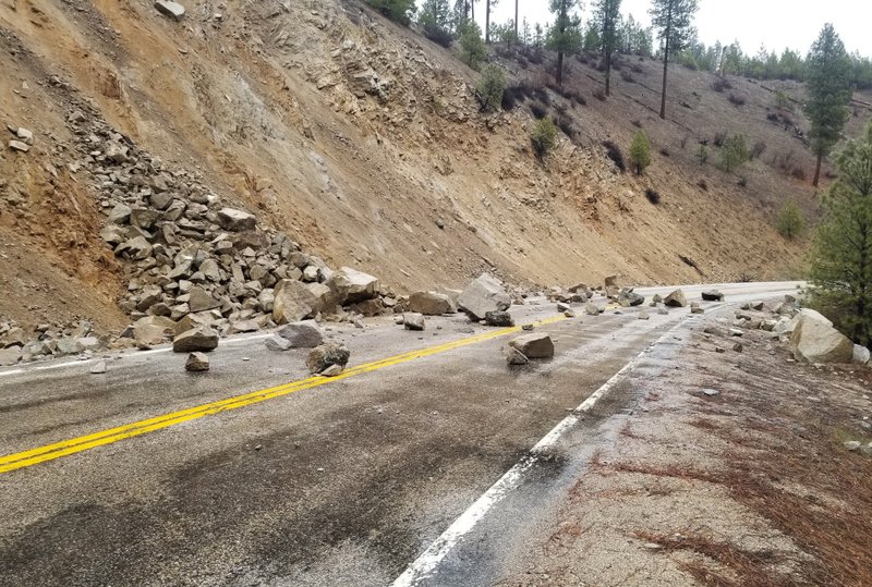 This photo provided by Tyler Beyer shows a rockslide on Highway 21 near Lowman, Idaho, after a magnitude 6.5 earthquake struck Tuesday, March 31, 2020. The earthquake struck north of Boise, Idaho, Tuesday evening, with people across a large area reporting shaking. (Tyler Beyer via AP)
