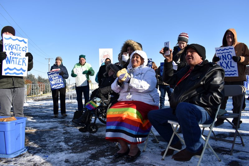 FILE - In this Oct. 29, 2019 file photo, opponents of the Keystone XL oil pipeline from Canada demonstrate in sub-freezing temperatures in Billings, Mont. Alberta is investing $1.1 billion in the disputed Keystone XL pipeline, a project that Alberta Premier Jason Kenney says is crucial for the province's economy. (AP Photo/Matthew Brown, File)