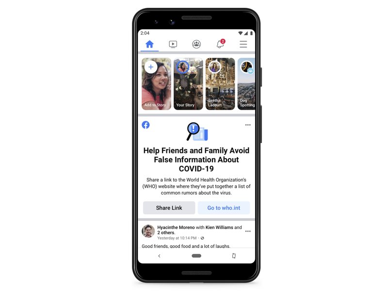 The new notice will be sent to users who have clicked on, reacted to, or commented on posts featuring harmful or false claims about COVID-19 after they have been removed by moderators. The alert, which will start appearing on Facebook in the coming weeks, will direct users to a site where the World Health Organization lists and debunks virus myths and rumors.
