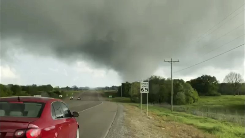 This image made from video provided by Thomas Marcum shows a tornado seen from State Highway 48 in Durant, Okla., Wednesday, April 22, 2020. (Thomas Marcum via AP)