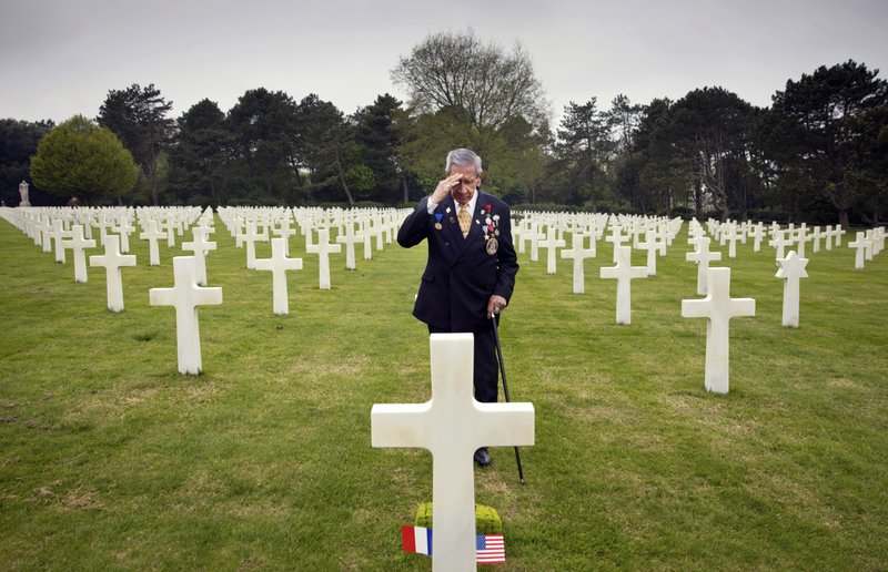 In this May 1, 2019 file photo, World War II and D-Day veteran Charles Norman Shay, from Indian Island, Maine, salutes the grave of fellow soldier Edward Morozewicz at the Normandy American Cemetery in Colleville-sur-Mer, Normandy, France. Instead of parades, remembrances, embraces and one last great hurrah for veteran soldiers who are mostly in their nineties to celebrate VE Day, it is instead a lockdown due to the coronavirus, COVID-19. (AP Photo/Virginia Mayo, File)