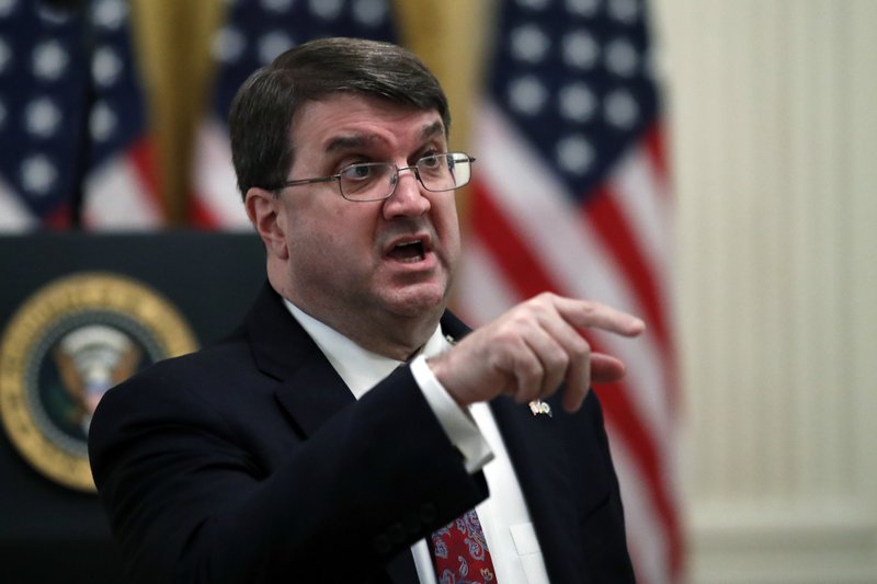 Veterans Affairs Secretary Robert Wilkie talks before President Donald Trump arrives to speak about protecting seniors, in the East Room of the White House, Thursday, April 30, 2020, in Washington. (AP Photo/Alex Brandon)