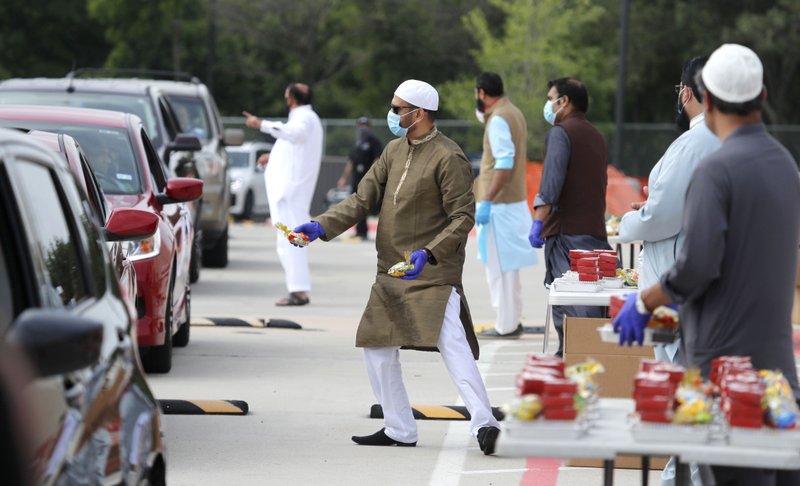 Organizers hand out treats during a drive through Eid al-Fitr celebration outside a closed mosque in Plano, Texas, Sunday, May 24, 2020. Many Muslims in America are navigating balancing religious and social rituals with concerns over the virus as they look for ways to capture the Eid spirit this weekend. (AP Photo/LM Otero)