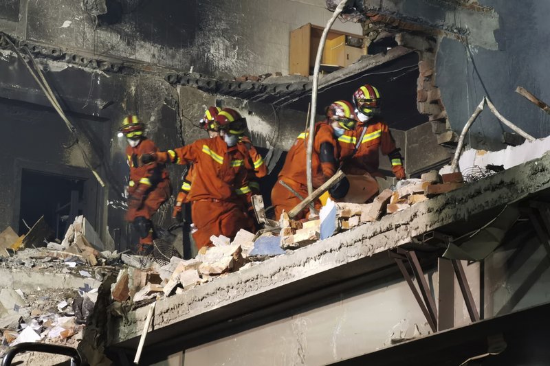 Firefighters look for victims in damaged buildings in the aftermath of a tanker truck explosion near a highway in Wenling in eastern China's Zhejiang province early Sunday, June 14, 2020. More than a dozen were killed and others injured after the tanker truck veered off the Shenyang-Haikou Expressway after the explosion. (Chinatopix via AP)