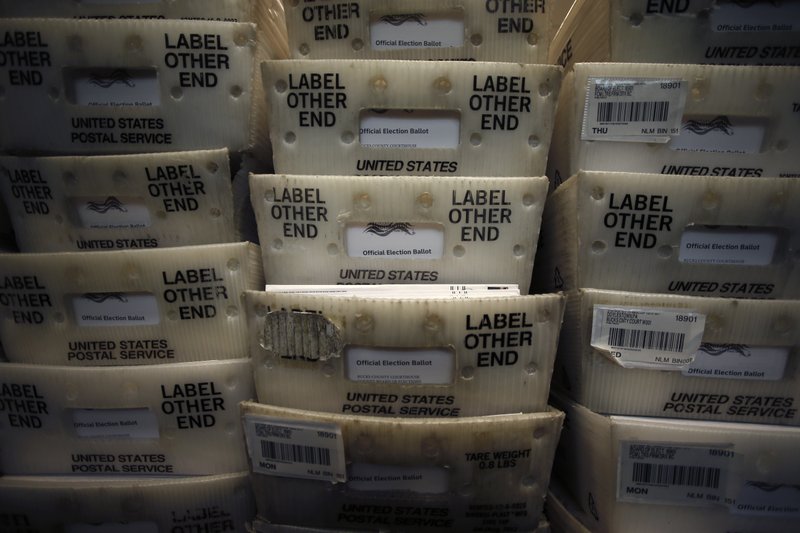 FILE - In this May 27, 2020 file photo, processed mail-in ballots are seen at the Bucks County Board of Elections office prior to the primary election in Doylestown, Pa. A network of deep-pocketed progressive donors are launching a $59 million effort to encourage people of color to vote by mail in November, a step many Democrats view as crucial to turning out the party's base during a global pandemic. (AP Photo/Matt Slocum, File)