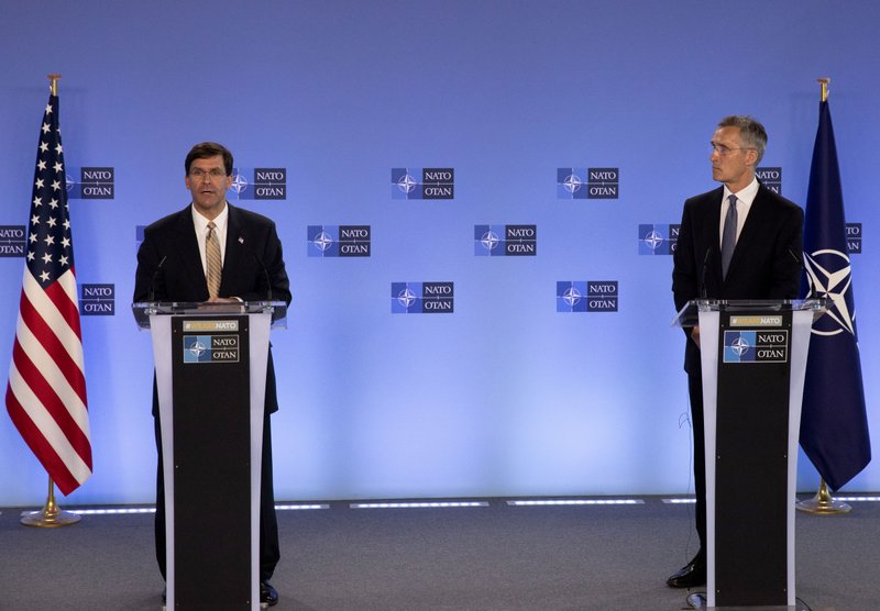 U.S. Secretary of Defense Mark Esper, left, and NATO Secretary General Jens Stoltenberg participate in a joint press conference at NATO headquarters in Brussels, Friday, June 26, 2020. U.S. Secretary of Defense Mark Esper is at NATO to follow-up on a broad range of issues raised during last week's NATO defense ministerial. (AP Photo/Virginia Mayo, Pool)