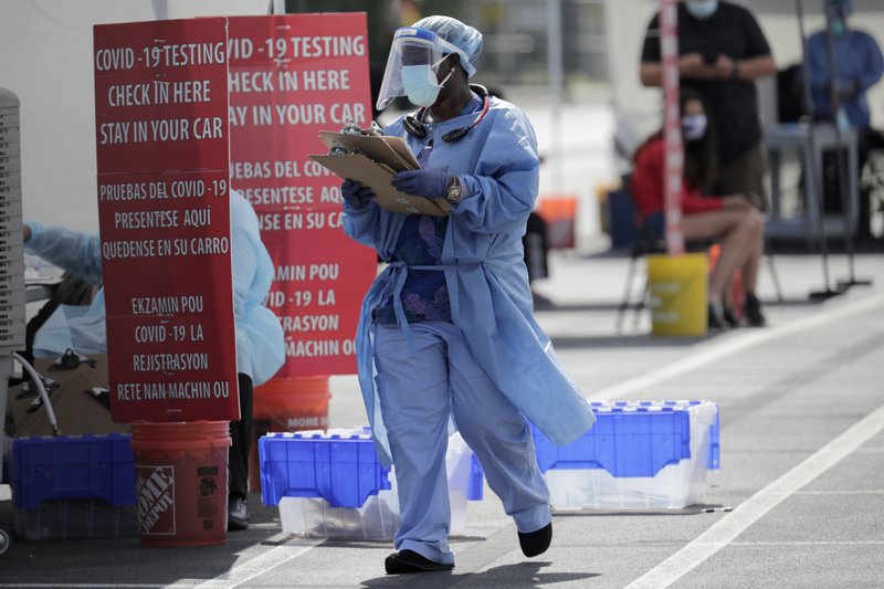 A health care worker works at a COVID-19 testing site sponsored by Community Heath of South Florida at the Martin Luther King, Jr. Clinica Campesina Health Center, during the coronavirus pandemic, Monday, July 6, 2020, in Homestead, Fla. (AP Photo/Lynne Sladky)