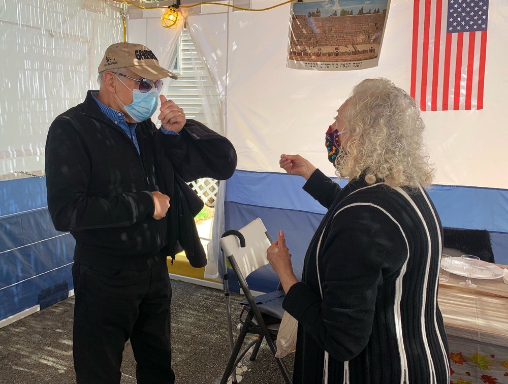 In this photo provided by Larry Brandspiegel, Holocaust survivors Israel "Sasha" Eisenberg, left, and Ruth Brandspiegel are reunited on Oct. 3, 2020, in East Brunswick, N.J. for the first time in more than 70 years since their families left the Hallein Displaced Persons Camp in Austria. They met under a sukkah, a temporary shelter used to celebrate the weeklong Jewish fall holiday of Sukkot. (Larry Brandspiegel via AP)