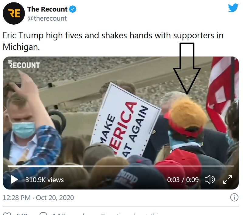 The presidents son ― who was out on the campaign trail in Michigan on behalf of his dad Tuesday ― did not wear a mask during the exchange. Neither did most of the supporters.