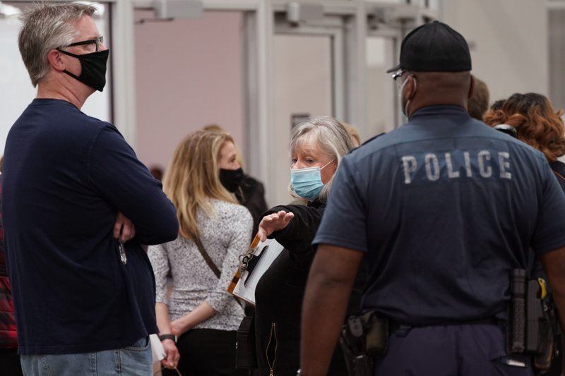 A Detroit police officer stops election challengers from entering the central counting board due to overcrowding, Wednesday, Nov. 4, 2020, in Detroit. (AP Photo/Carlos Osorio)
