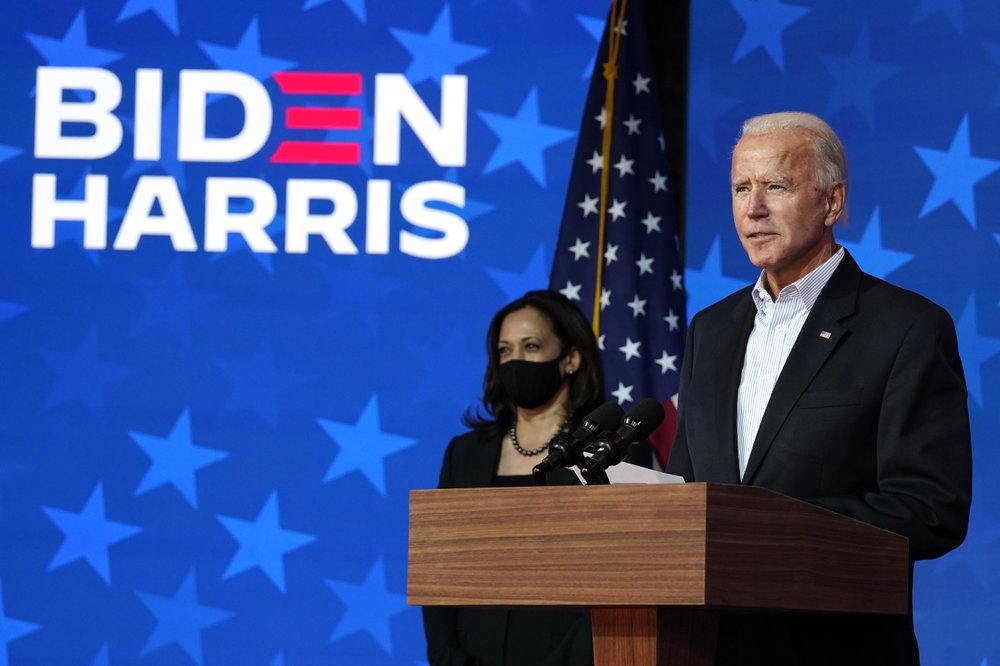 - Democratic presidential candidate former Vice President Joe Biden speaks Thurs., Nov. 5, 2020, in Wilmington, Del. Democratic vice presidential candidate Sen. Kamala Harris, D-Calif., stands at left.