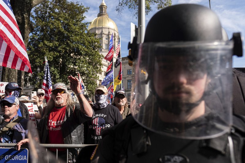 An officer in riot gear stands between supporters of President Donald Trump and counter protesters as the groups yell at each other outside of the Georgia State Capitol in Atlanta on Saturday, Nov. 21, 2020. (AP Photo/Ben Gray)