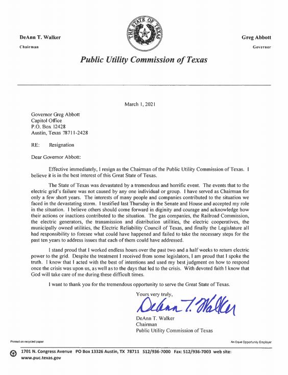 Gov. Greg Abbott appointed Walker to the commission in 2017, and she is one of two commissioners who used to work in his office. In a letter to Abbott, Walker said she accepted her role in the outages but that others should acknowledge their responsibility, including gas companies and lawmakers.