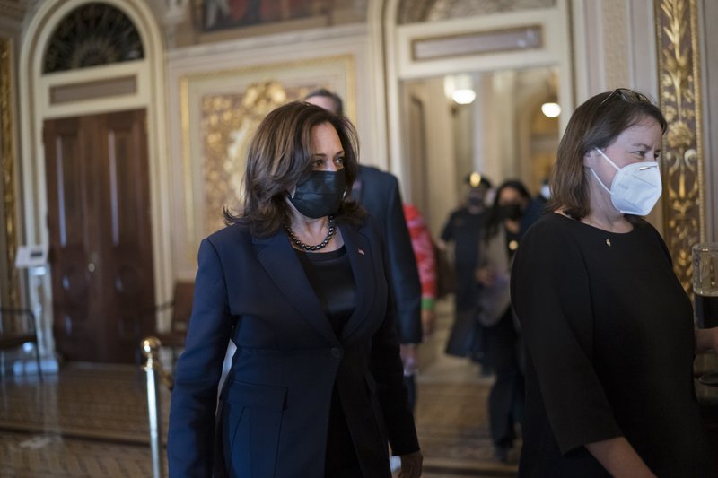 Vice President Kamala Harris arrives to break the tie on a procedural vote as the Senate works on the Democrats' $1.9 trillion COVID relief package, on Capitol Hill in Washington, Thursday, March 4, 2021. (AP Photo/J. Scott Applewhite)