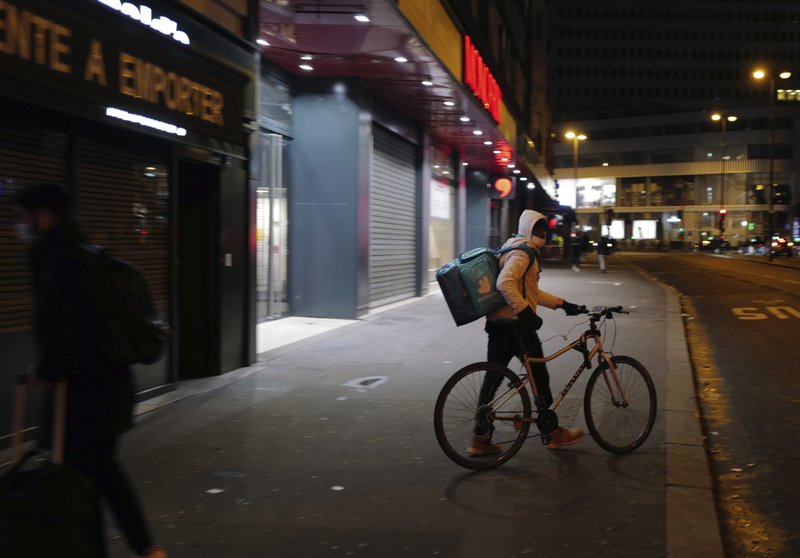 FILE - In this file photo dated Monday Feb. 15, 2021, a Deliveroo food delivery worker pushes his bike in front of restaurant in Paris. Shares in the app-based meal delivery service Deliveroo tumbled by as much as a third in their U.K. stock market debut on Wednesday March 31, 2021. (AP Photo/Francois Mori, FILE)