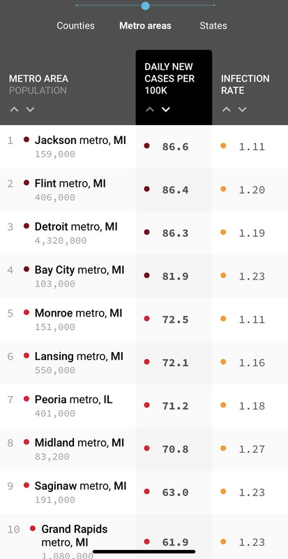 (15,511 posts)Michigan currently has 9 of the worst 10 metro areas for new infections... in the ENTIRE COUNTRY.