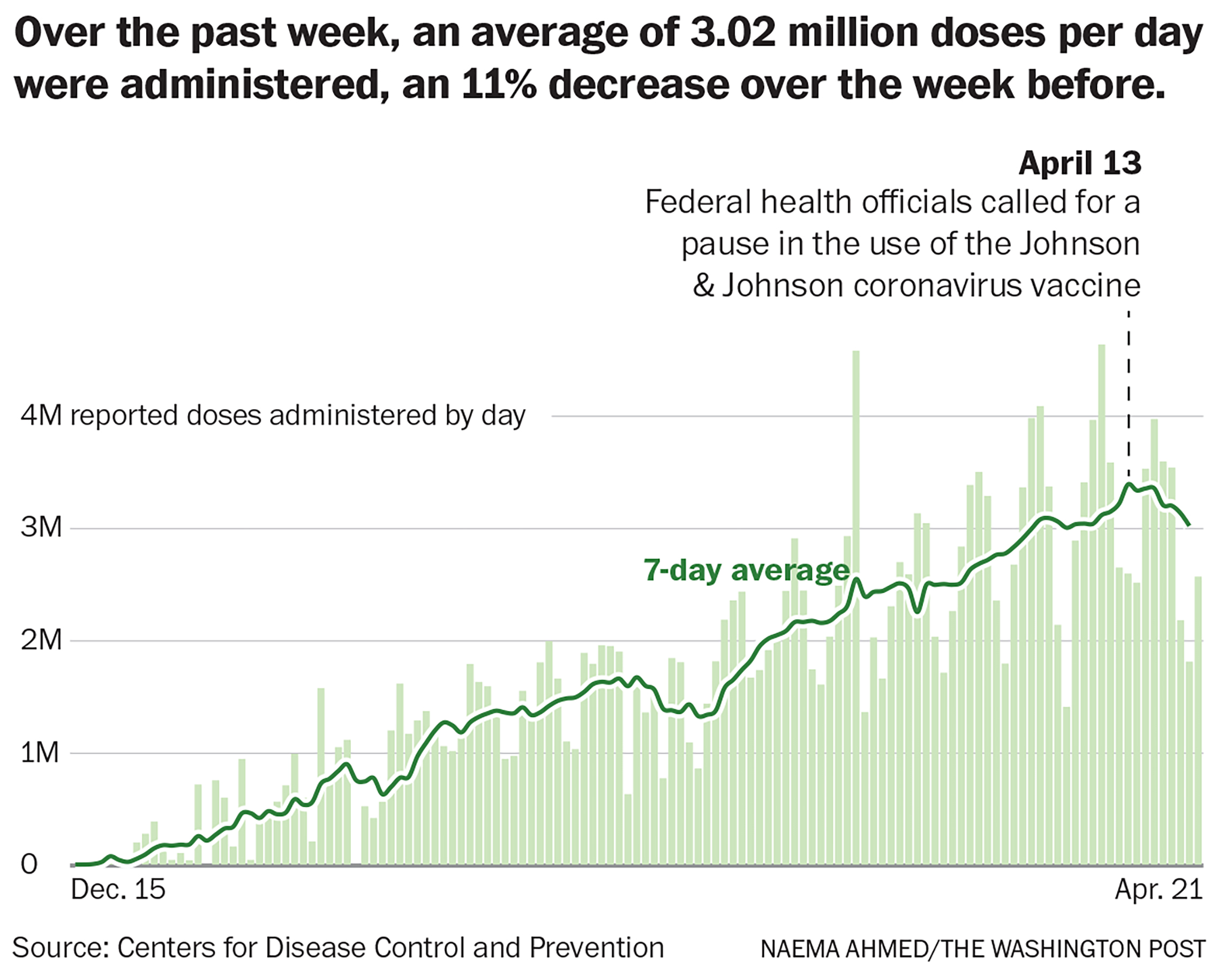 Read more: https://www.washingtonpost.com/health/2021/04/21/vaccinations-downturn-jj-pause-soft-demand/