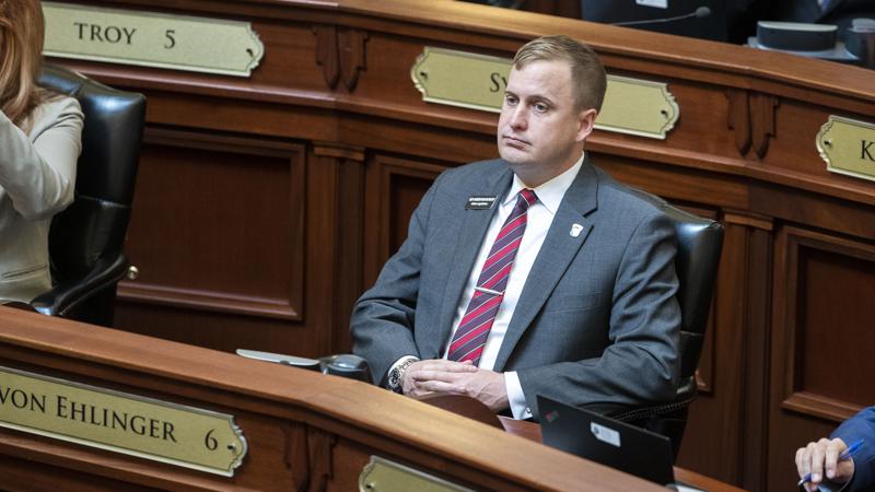 Rep. Aaron von Ehlinger, R-Lewiston, attends opening business as the Idaho House of Representatives convenes Wednesday, April 21, 2021 at the Statehouse in Boise, Idaho. The Idaho lawmaker facing rape allegations from a 19-year-old intern was previously warned against hitting on women who work at the Statehouse after his colleagues heard complaints from other staffers, according to documents gathered by the Legislatures ethics committee and obtained by The Associated Press. The Boise Police Department has a criminal investigation underway and the Legislatures Ethics Committee is scheduled to hold a public hearing on Wednesday, April 28. (Darin Oswald/Idaho Statesman via AP)