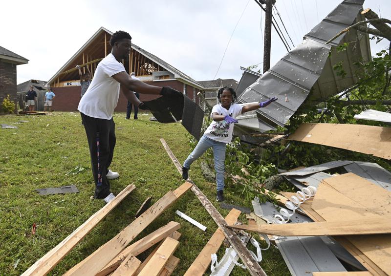Derrick Pounds and his daughter, Madison, 6, clean up debris around their residence on Elvis Presley Drive in Tupelo, Miss., Monday, May 3, 2021. Multiple tornadoes were reported across the state on Sunday. (AP Photo/Thomas Graning)
