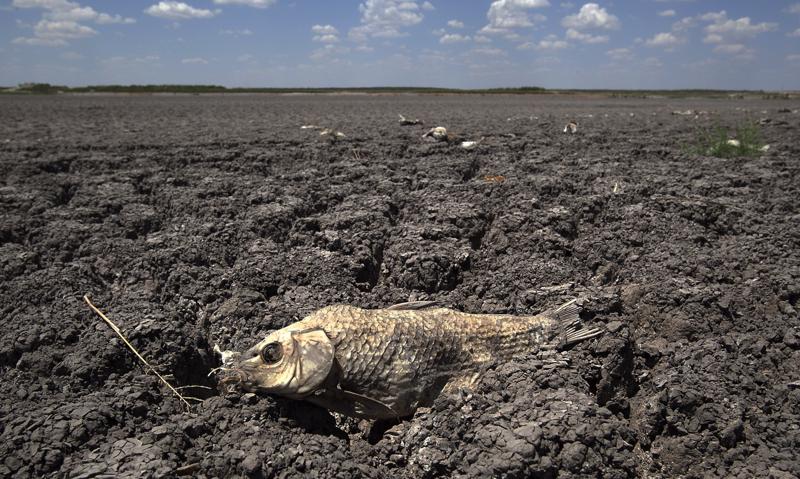 FILE - In this Wednesday, Aug. 3, 2011 file photo, the remains of a carp are seen on the dry lake bed of O.C. Fisher Lake in San Angelo, Texas. According to data released by the National Oceanic and Atmospheric Administration on Tuesday, May 4, 2021, the new United States normal is not just hotter, but wetter in the eastern and central parts of the nation and considerably drier in the West than just a decade earlier. (AP Photo/Tony Gutierrez)