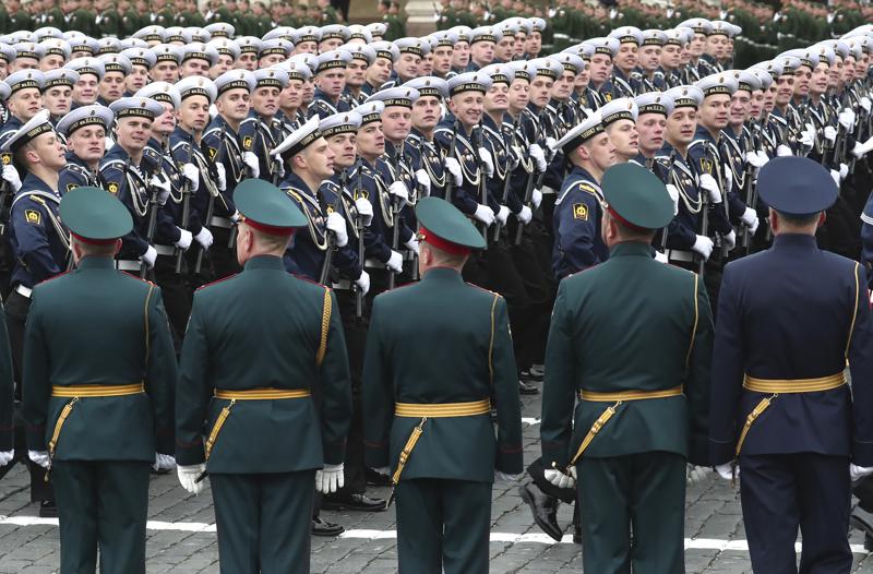 Russian sailors march toward Red Square during the Victory Day military parade in Moscow, Russia, Sunday, May 9, 2021, marking the 76th anniversary of the end of World War II in Europe. (AP Photo)