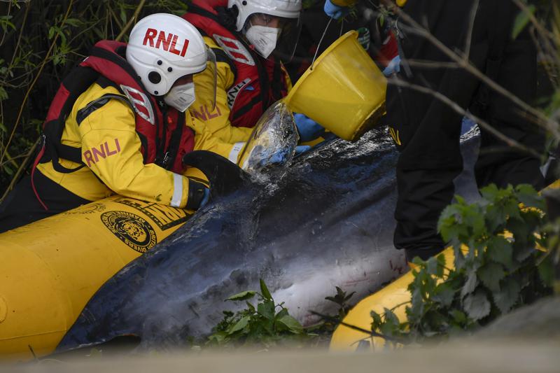 Lifeboat workers attempt to assist a stranded young Minke whale on the River Thames near Teddington Lock, in London, Monday, May 10, 2021. A Port of London Authority spokesperson said a whale had never been seen this far up the Thames before, 95 miles from its mouth. The whale had been freed on Sunday after it became stuck at Richmond lock but has remained in the Thames.(AP Photo/Alberto Pezzali)
