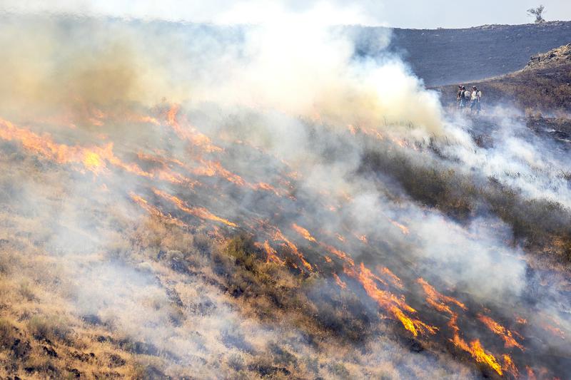 People stand behind the fire line as the flames spread through dry grasses at the Steptoe Canyon Fire Thursday, July 22, 2021 in Colton, Wash. (August Frank/Lewiston Tribune via AP)