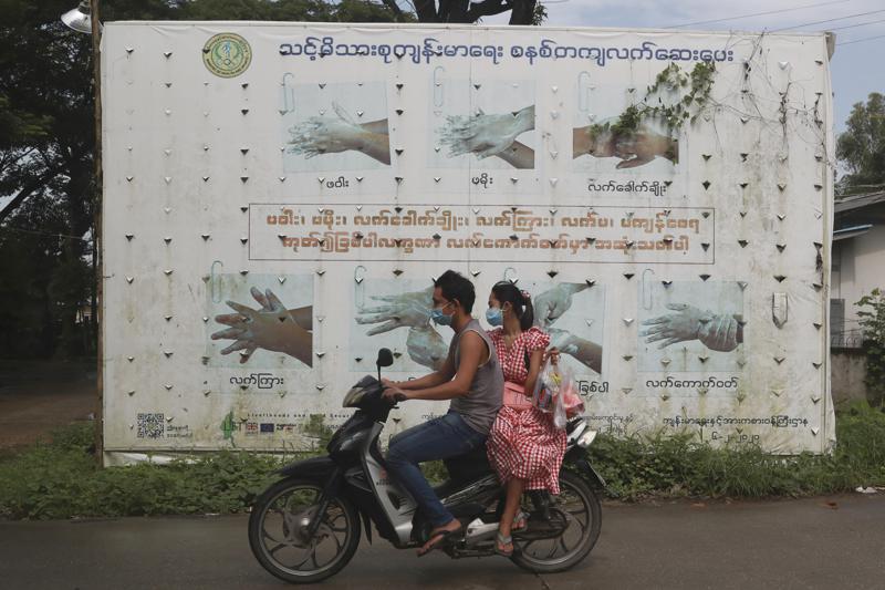 People wearing face masks to help curb the spread of the coronavirus ride a motorcycle past a Health Ministry public information campaign billboard about proper hand washing in Shwe Pyi Thar township in Yangon, Myanmar Wednesday, July 28, 2021. (AP Photo)