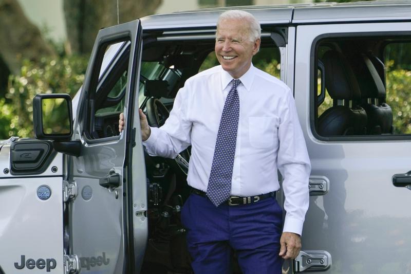 President Joe Biden smiles after driving a Jeep Wrangler 4xe Rubicon on the South Lawn of the White House in Washington, Thursday, Aug. 5, 2021, during an event on clean cars and trucks. (AP Photo/Susan Walsh)