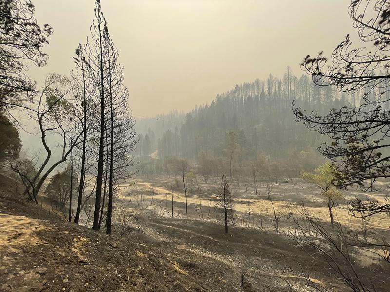 Burned trees and smoke fill the Bear River canyon after the River Fire burned through Friday, Aug. 6, 2021 in Chicago Park, Calif. Firefighters are gaining the upper hand on the fast-moving River Fire that broke out Wednesday near the town of Colfax and destroyed nearly 90 homes and other buildings. More than 5,000 people were ordered to evacuate in Placer and Nevada counties, state fire officials said. (Elias Funez/The Union via AP)