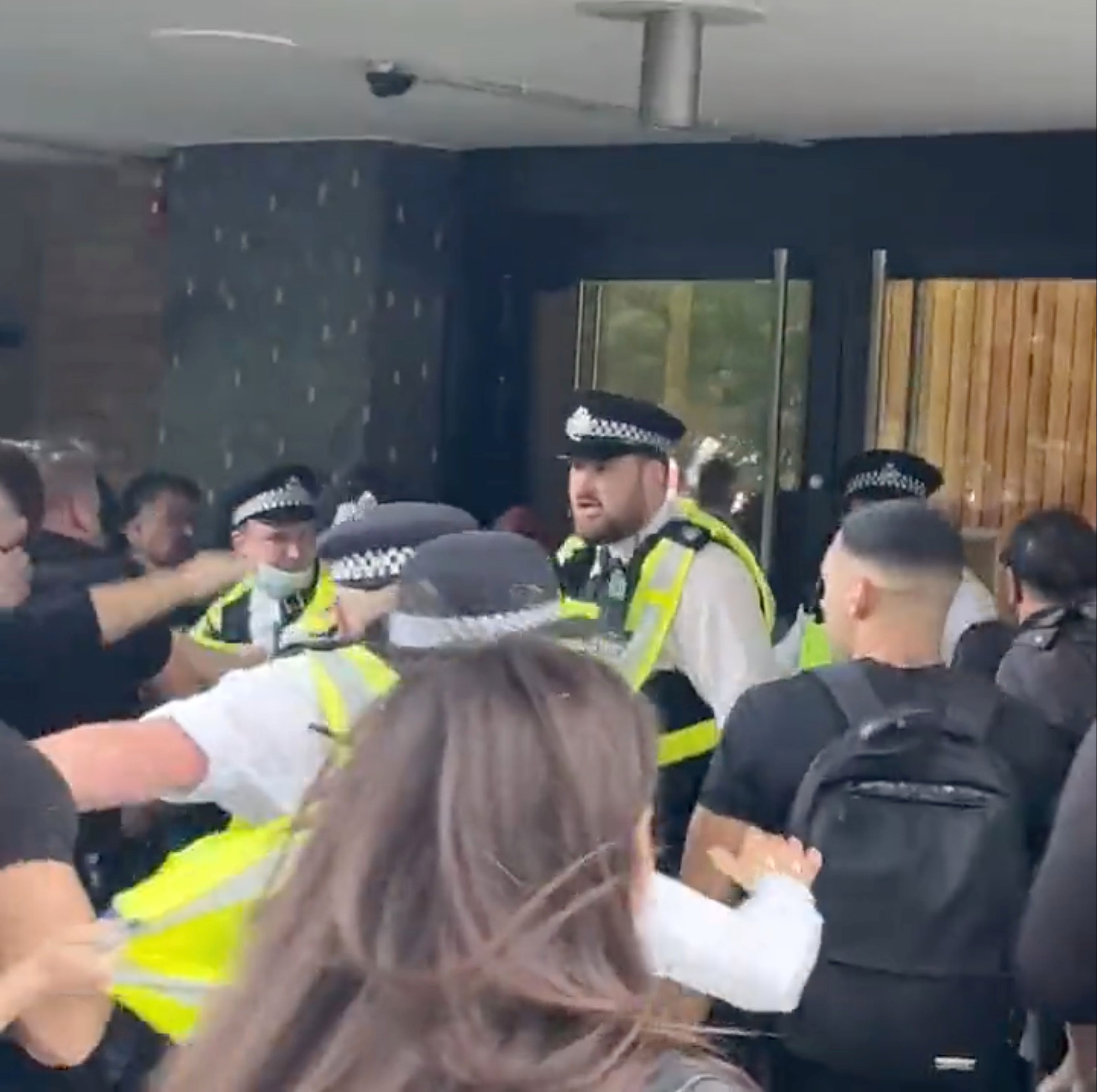 Hundreds of people outside the studio building chanted shame on you, the Guardian newspaper reported, adding that many appeared to think they were protesting a major BBC News operation and that pre-protest material had played up the buildings links to the broadcaster.Officers were pushed by a small number of demonstrators [running toward the entrance,] but the arrival of additional officers quickly restored calm, Londons Metropolitan Police said in a statement. It added that an officer suffered a minor facial injury and that no arrests were made. The BBC declined to comment.