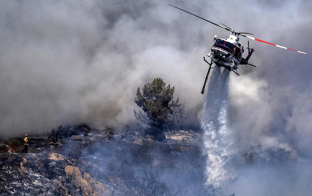 A firefighter is dwarfed by an aerial drop at the the Chaparral Fire in Murrieta which still blazes, Sunday, August 29, 2021. Several homes appear to be evacuated in the area. (Cindy Yamanaka/The Orange County Register via AP)