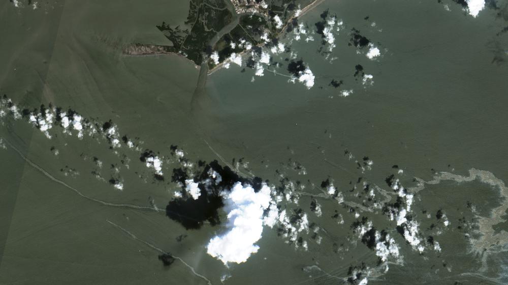 In a satellite image provided by Maxar Technologies, an oil slick is shown on Sept. 2, 2021 south of Port Fourchon, La. The U.S. Coast Guard said Saturday, Sept. 4, that cleanup crews are responding to a sizable oil spill in the Gulf of Mexico following Hurricane Ida. (Maxar Technologies via AP)