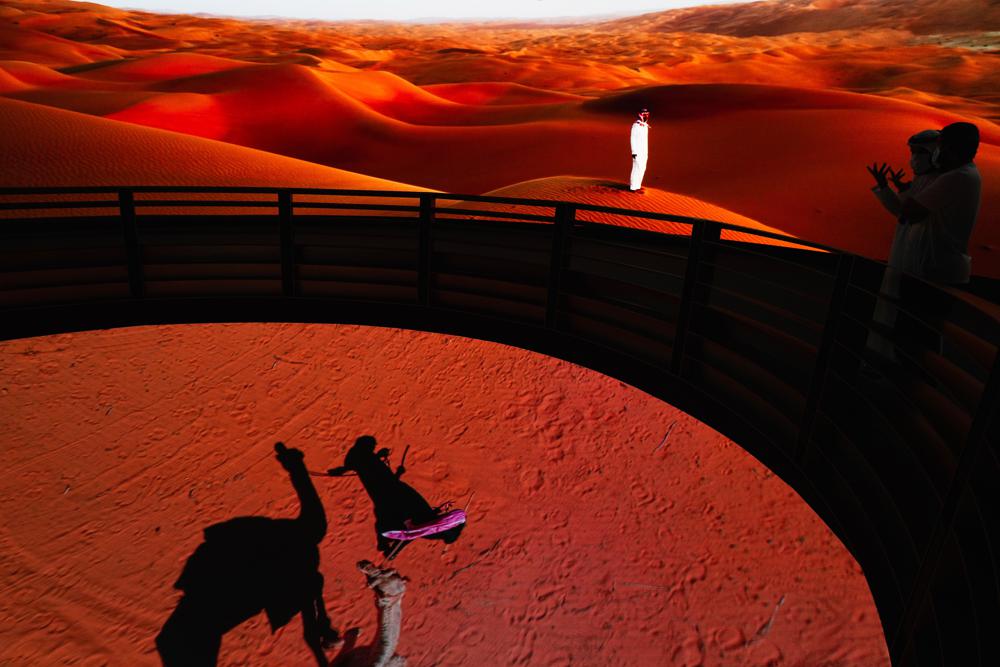 Men watch a display at the Saudi Arabia pavilion at Expo 2020 in Dubai, United Arab Emirates, Saturday, Oct. 2, 2021. (AP Photo/Jon Gambrell)