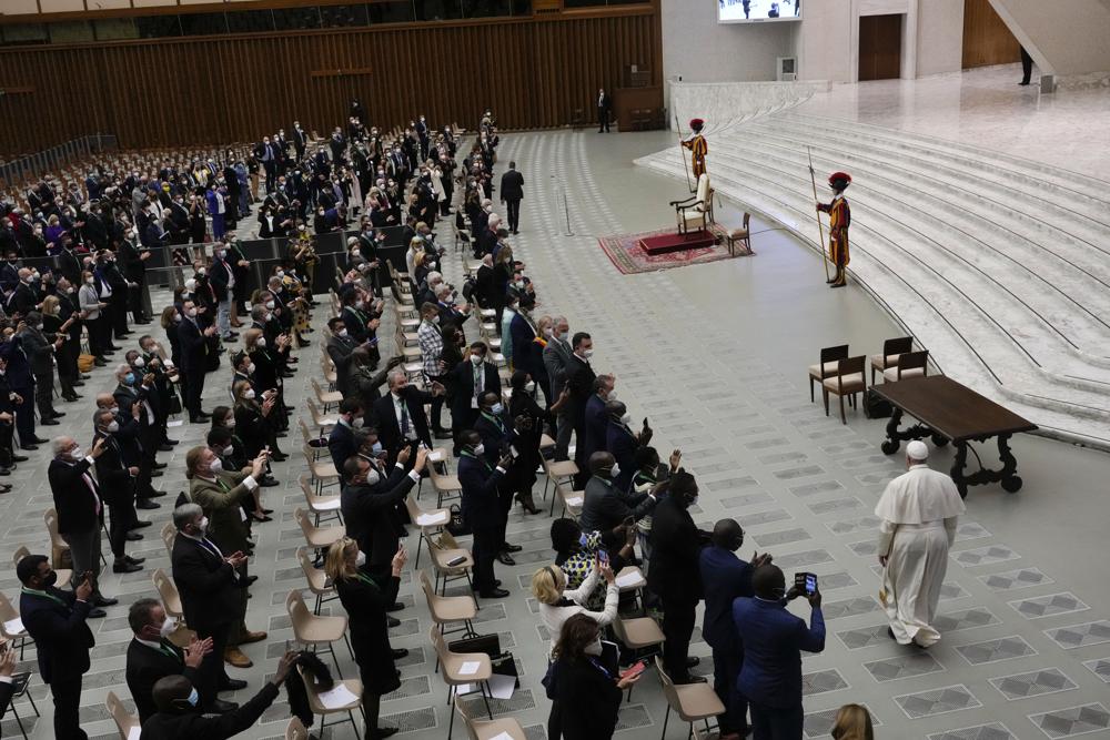 Pope Francis arrives to meet with the participants to the inter-parliamentary meeting on the COP26 in the Paul VI Hall at the Vatican, Saturday, Oct. 9, 2021. (AP Photo/Gregorio Borgia)