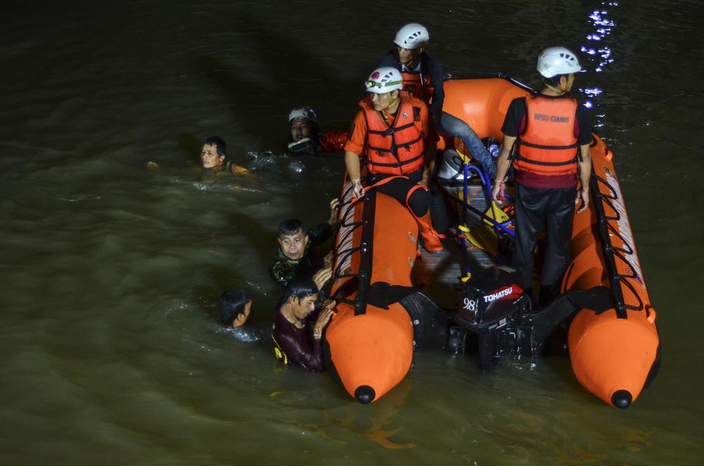 Rescuers search for victims of drowning in a river in Ciamis, West Java, Indonesia, Friday, Oct. 15, 2021. A number of students drowned during a school outing for a river cleanup on Friday evening in Indonesia's West Java Province. (AP Photo/Yopi Andrias)